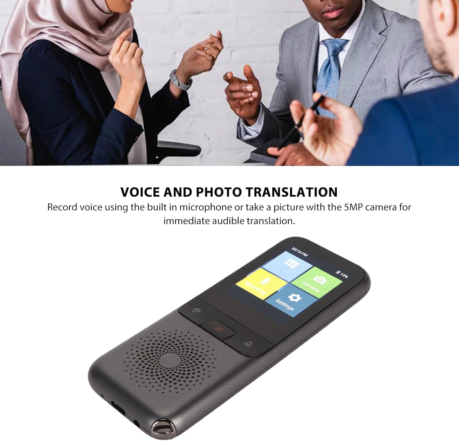 [Voice and Photo Translation]: Both record voice using the built in microphone and take picture with the 5MP camera can get immediate audible translation.