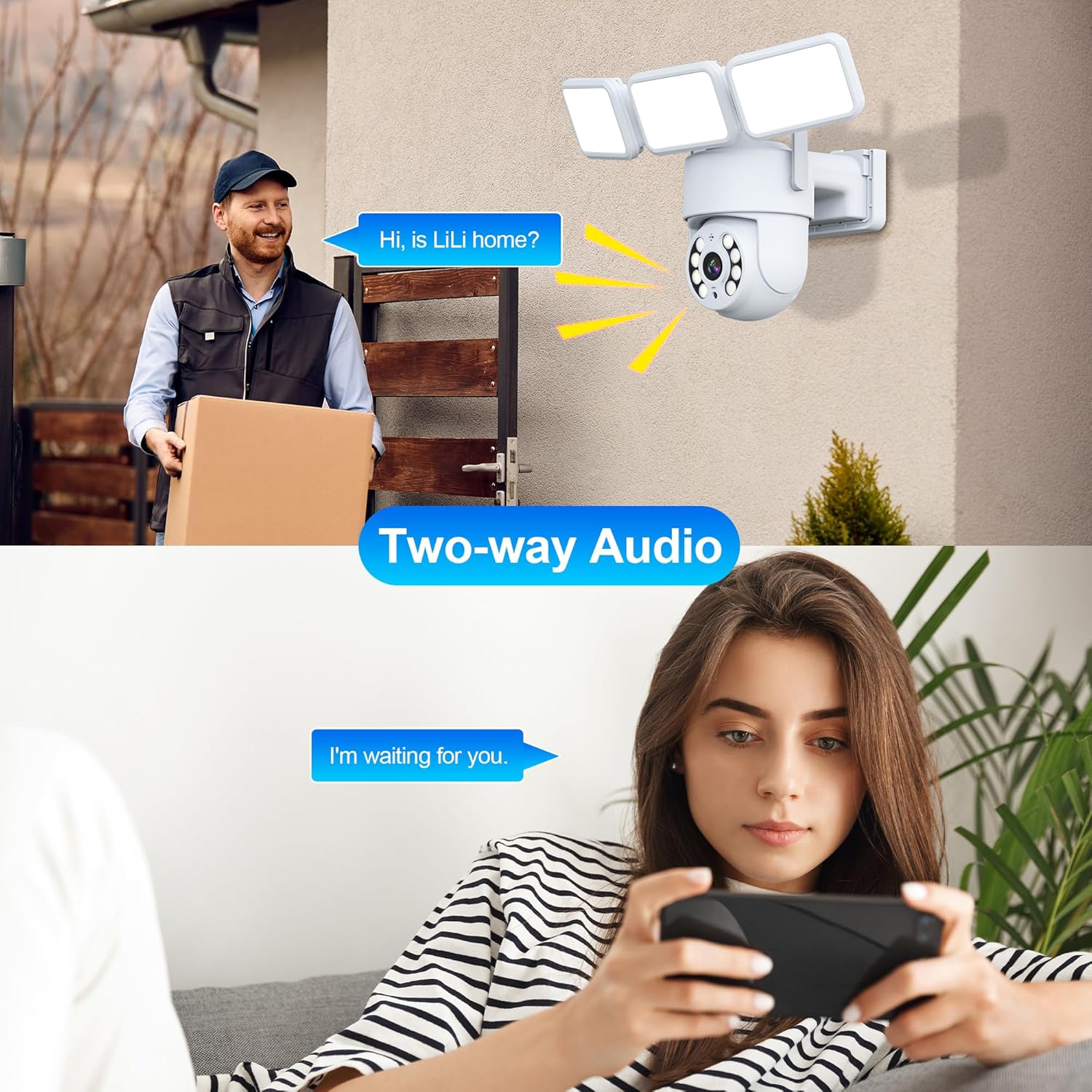 [Two-way Talk + 105dB Siren&IP65 Weather Resistance]:The flood light security camera has a built-in microphone and speaker, which can provide 2-Way Talk, you could talk and listen to visitors, and also have a real time conversation with the courier even if you are not at home.Communicate through the app and sound a loud siren for added deterrence.The shell of the house cameras outdoor is made of excellent waterproof material ,Rated to withstand any weather for 24/7 peace of mind.