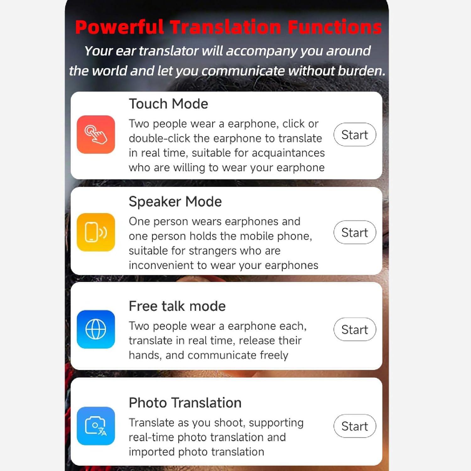 3 POWERFUL TRANSLATION MODES: Touch mode (real time translation by single or double touch with one earphone for each person). Speaker mode (one person wears the earphone, the other holds the phone, suitable for strangers unable to wear your earphones). Flexible talk mode (real time translation by both wearing earphones, freeing hands for conversation).