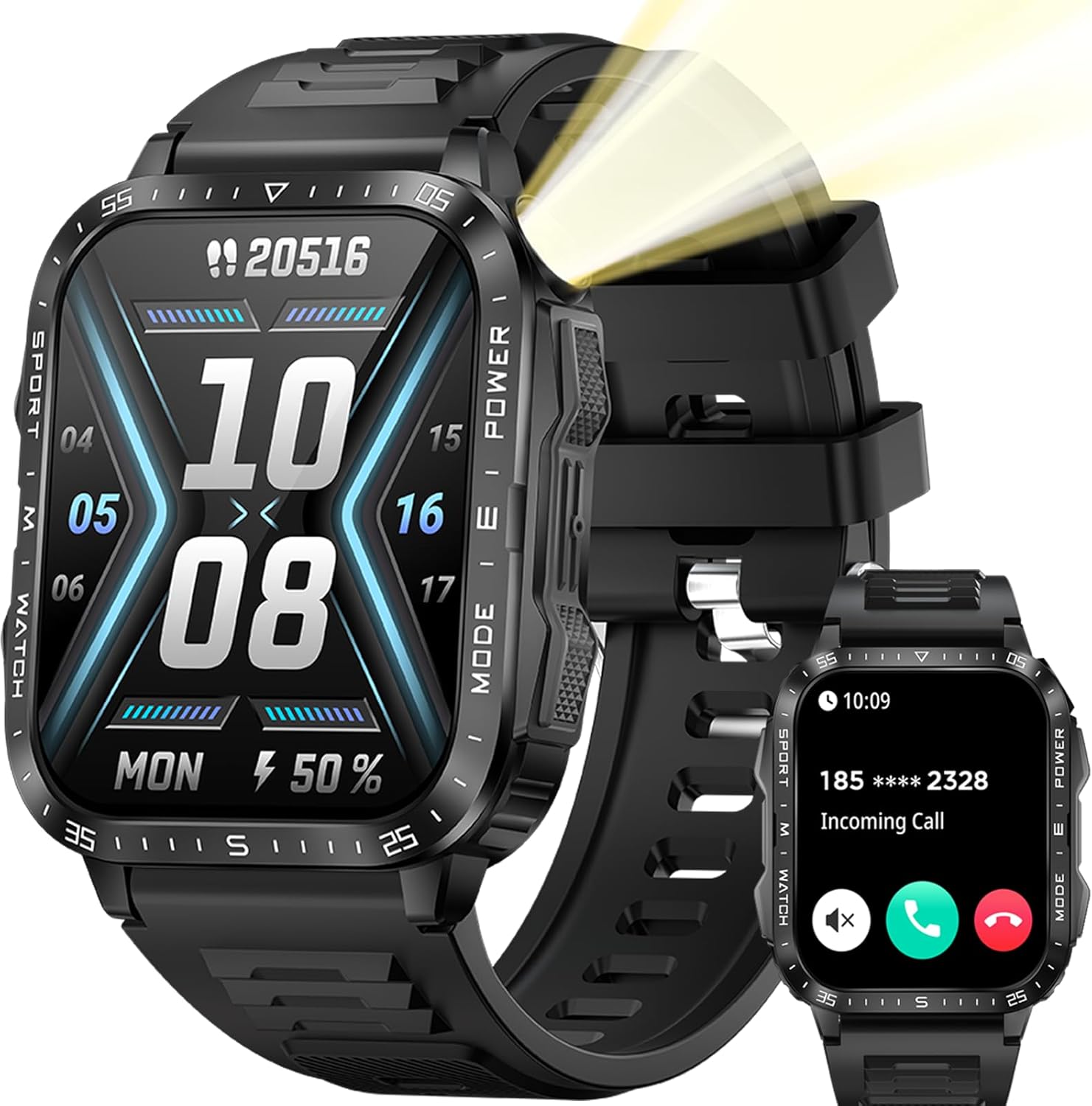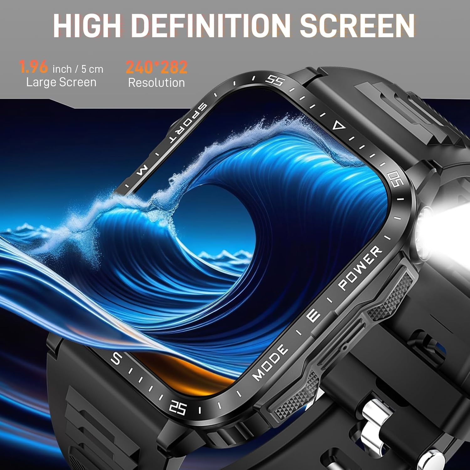 LED Flashlight & 3ATM Waterproof: Dealark rugged smartwatch for men is equipped with a bright LED flashlight and compass, with a lighting distance of up to 6-10 meters, so you are no longer afraid of the dark and getting lost when traveling! Dealark military smart watch for men is engineered with a 3ATM waterproof feature, allowing you to dive up to 30 meters deep.