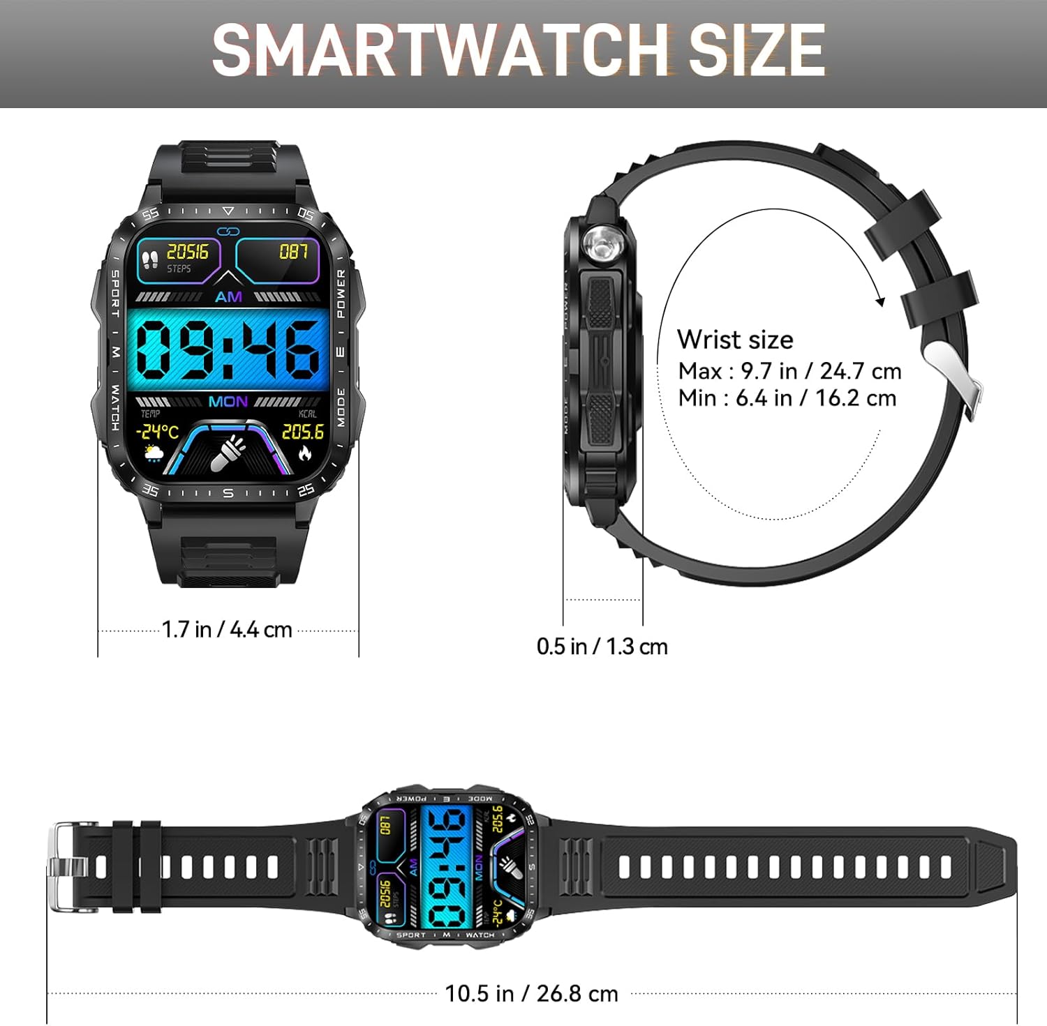 Powerful 430mAh Battery: Dealark tactical smart watch for men boasts a robust 430mAh battery that lasts 5-7 days on a full charge and offers a standby time of up to 25 days. Ideal for outdoor enthusiasts, this big battery smartwatch ensures you never run out of power during your adventures.