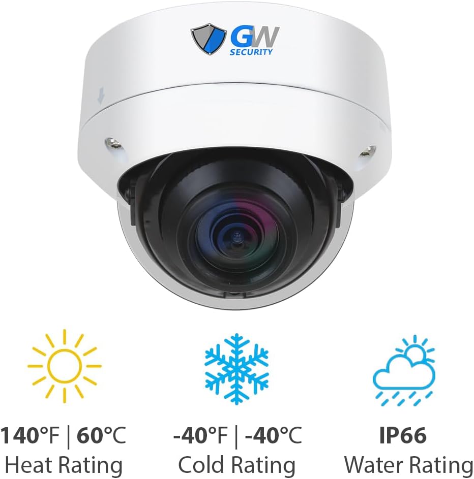 The Newest 8MP Camera Overview – 8 Megapixels (3840×2160) UltraHD 4K Video Record and Playback This GW Security 4K IP camera employs advanced high resolution 2160P in combination to the latest 8.0 Megapixel image sensor which provides the best quality image day and night, resolution up to 3840 x 2160. This camera can record real-time 6MP@30FPS and 8MP@20FPS, so that recorded video plays back smoothly and clearly. With GW Realtime 4K 2160p camera, you can see your surveillance footage in stunning 4K resolution(FOUR TIMES the clarity of 1080p) for amazing detail and superior recognition of faces or license plates. Built in 2.8mm 8MP HD Lens for wide angle view. 18Pcs Infrared LED illumination for recording video at night up to 100Ft. This POE camera is completely Power over Ethernet so setup is clean and simple with just a single cable. Designed for easy installation, the dome camera has a waterproof housing, fits in most indoor and outdoor installations. It is ideal for home or business
