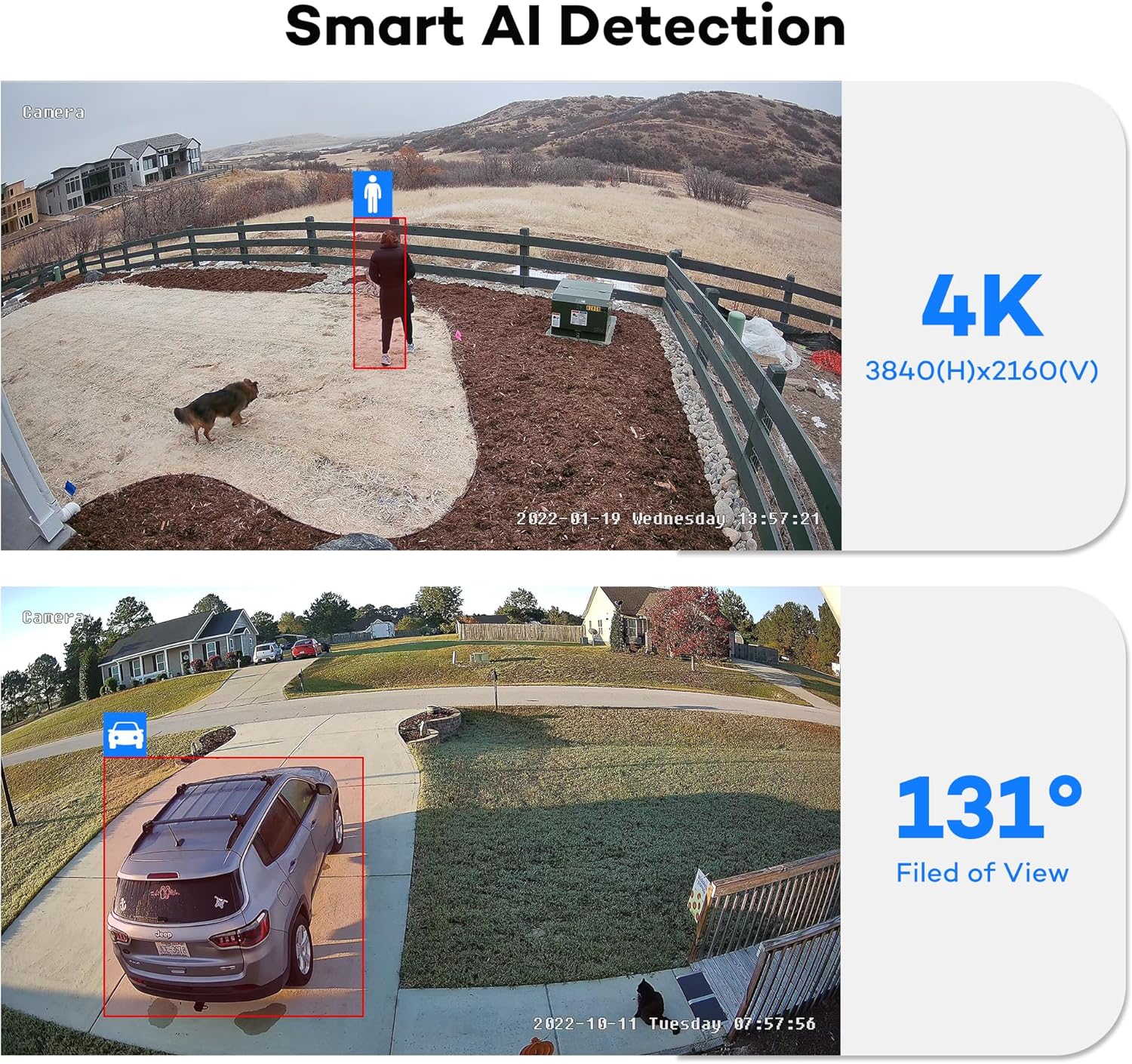 4K 8 million pixels- 3840(H)x2160(V), 4 times the clarity of 1080P.Ultra wide field of view- 131°(D), 110°(H), 58°(V).