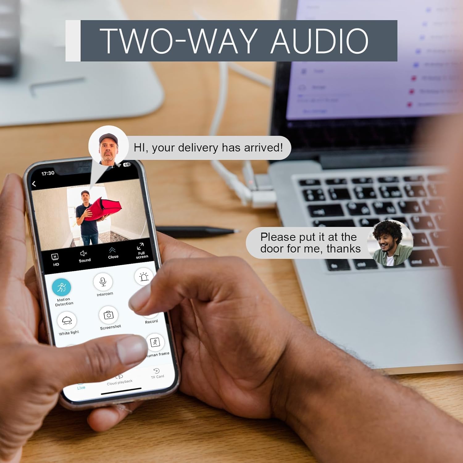 【2-Way Audio & Custom Alerts】The security camera is located in the inside of the speaker and microphone, which supports Two-way Audio. You can talk to the people in front of the camera at any time through the mobile app. There are many local alarm sounds in the camera application (such as Dog barking, Ding Dong) to choose from, or you can also import other sounds and set the flash effect, so that it can warn bad people at critical moments!