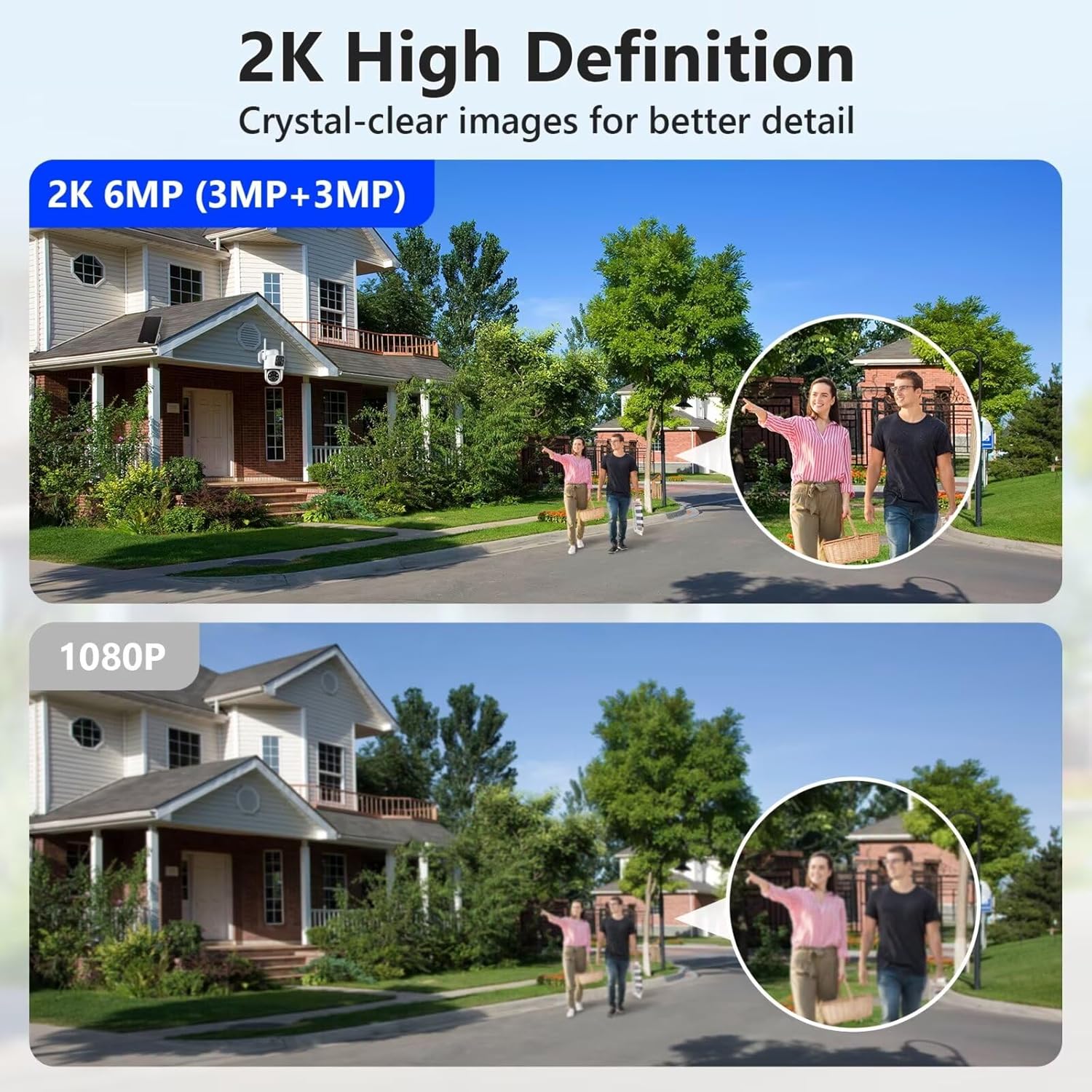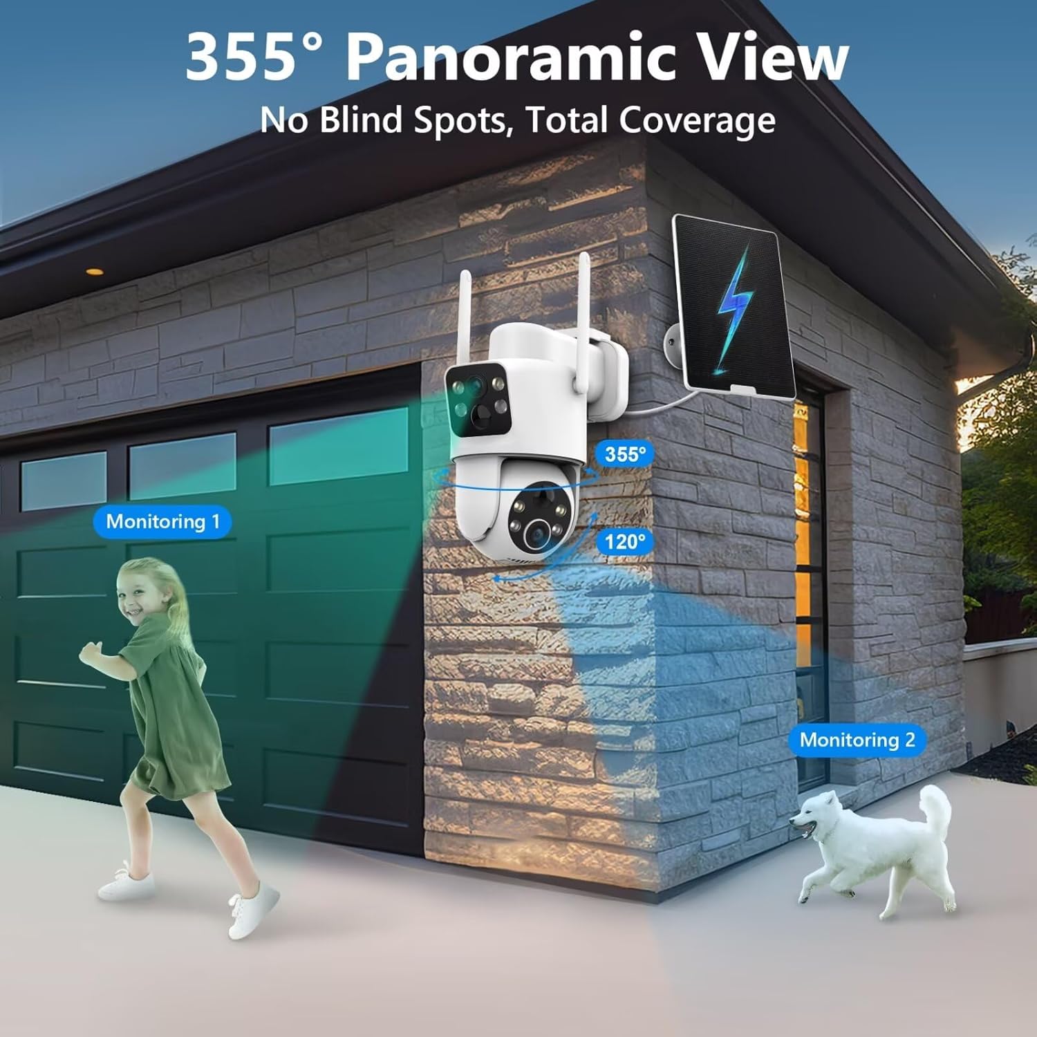 【Dual 3MP Lenses & 220° Coverage】 Capture every detail with our 6MP (2K) resolution solar camera outdoor wireless. 355° pan and 120° tilt offer a sweeping 220° view, eliminating blind spots. AI-powered motion detection ensures you only get alerts that matter