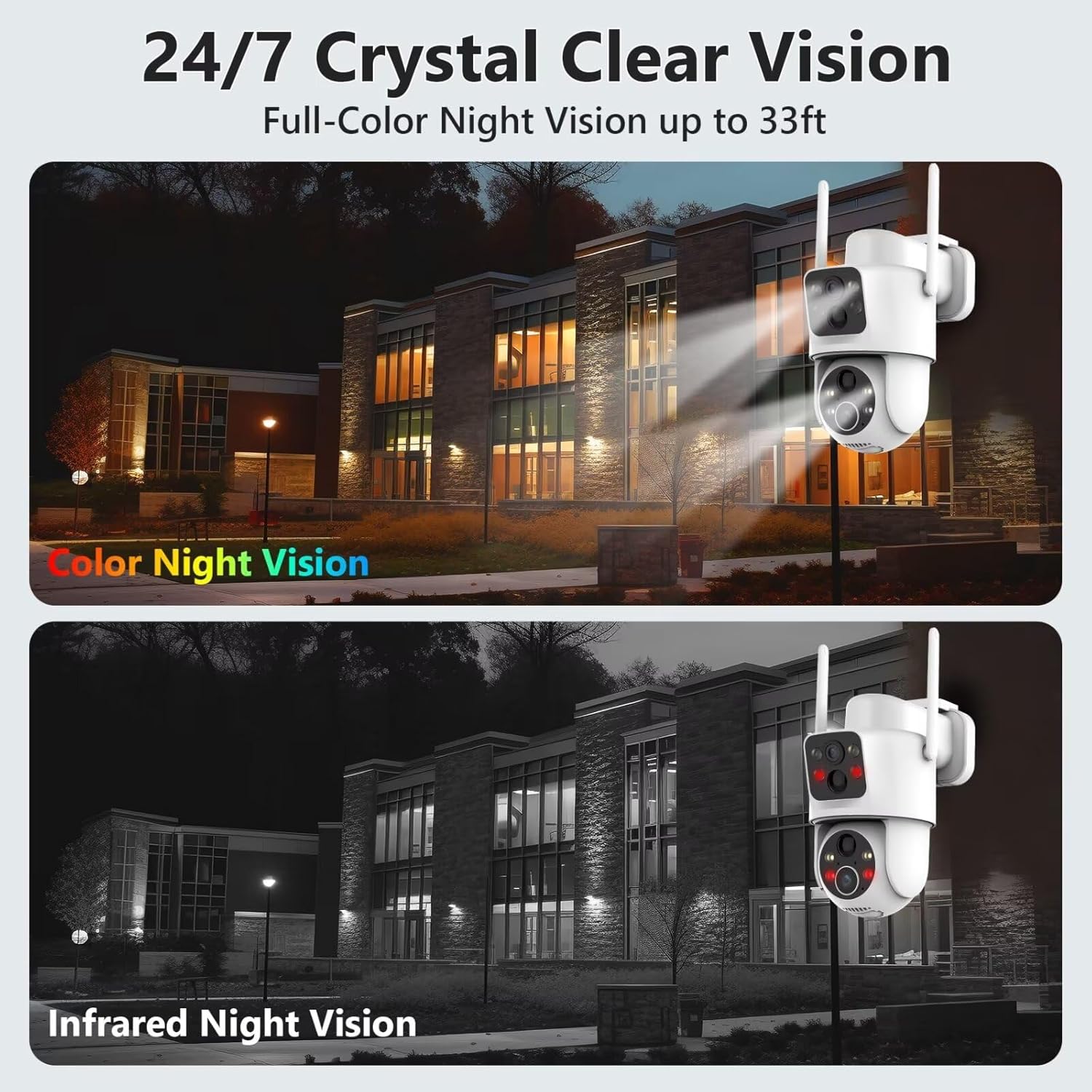 【Crystal Clear Day & Night Vision】 See vivid colors up to 33ft at night with powerful spotlights. 2K resolution (2048*1536) ensures you never miss a detail, day or night. This solar camera outdoor wireless offers infrared night vision extending visibility up to 65ft in black and white mode