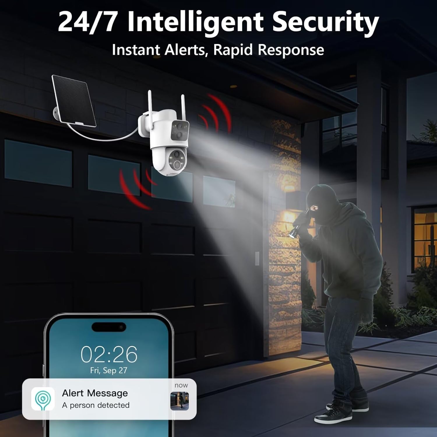 【Smart AI Detection & Two-Way Audio】 Advanced motion sensors with human detection minimize false alarms from pets or moving branches. Communicate in real-time through built-in mic and speaker. Greet visitors or deter intruders from anywhere using our intuitive app with this solar camera outdoor wireless