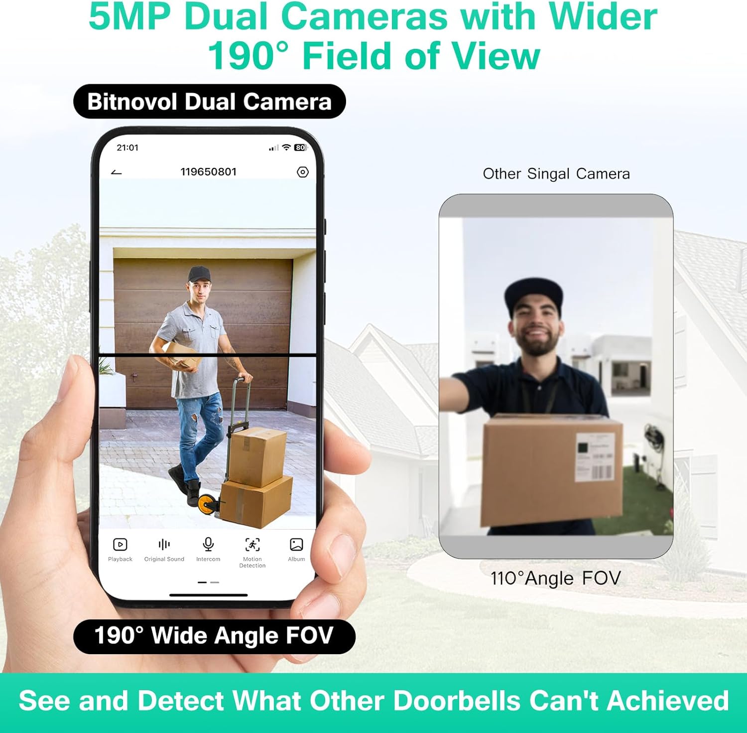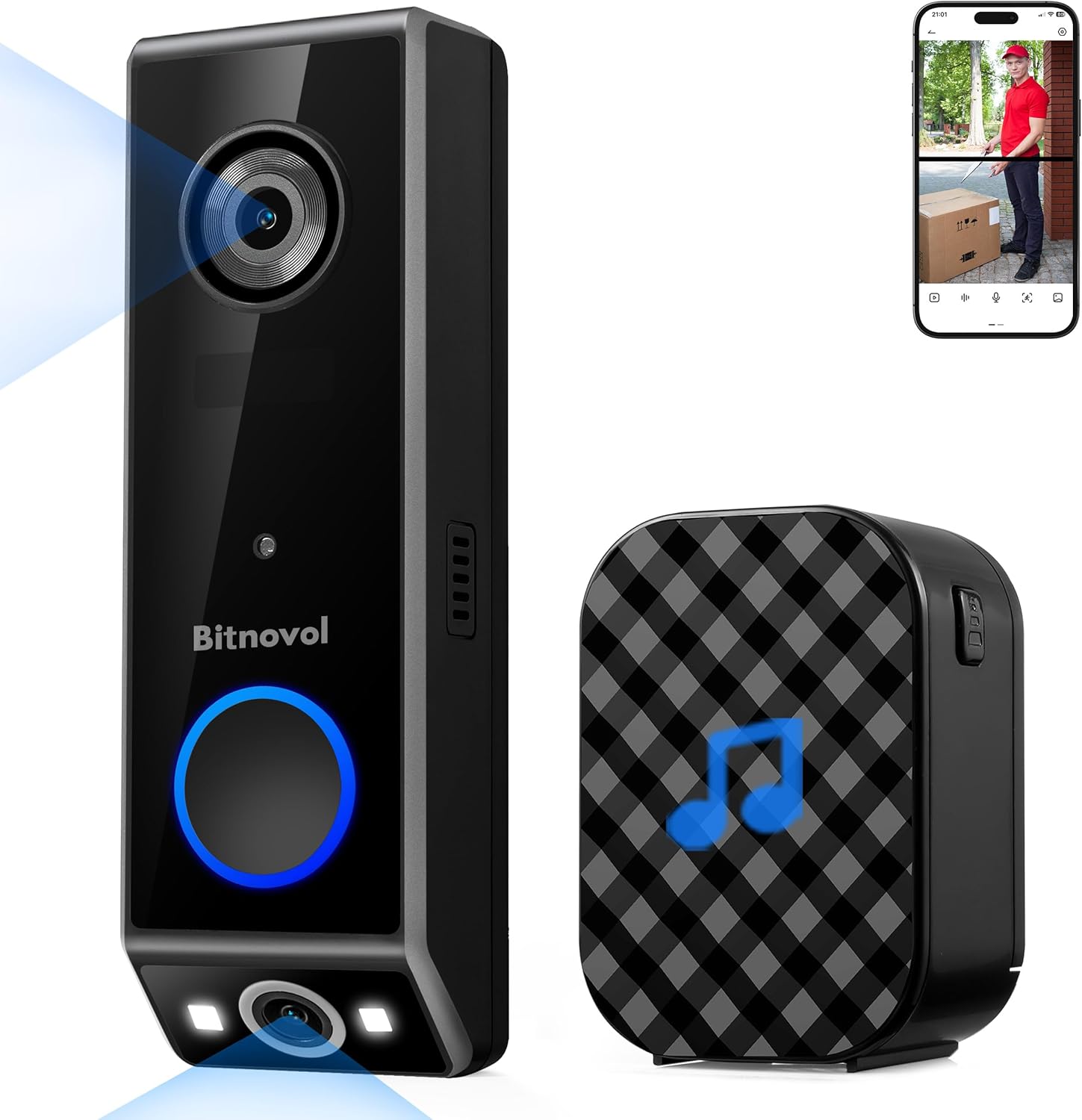 【Dual Cameras & Double Security】Bitnovol wireless doorbell camera features dual cameras for superior views. Two cameras work together to deliver advanced viewing. The front-facing camera focuses on people, while the downward-facing camera fills in the gaps with a view of the floor in front of your door. When someone ring video doorbell wireless,you can see a person from head to toe or the package on the ground.