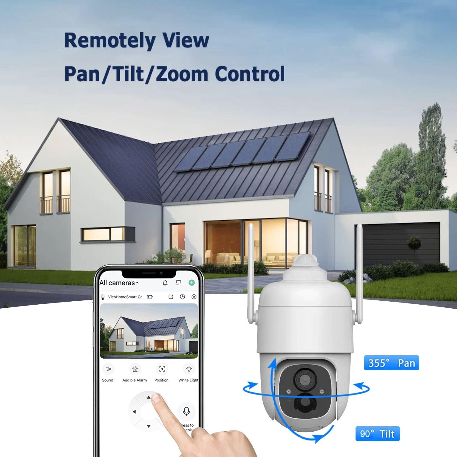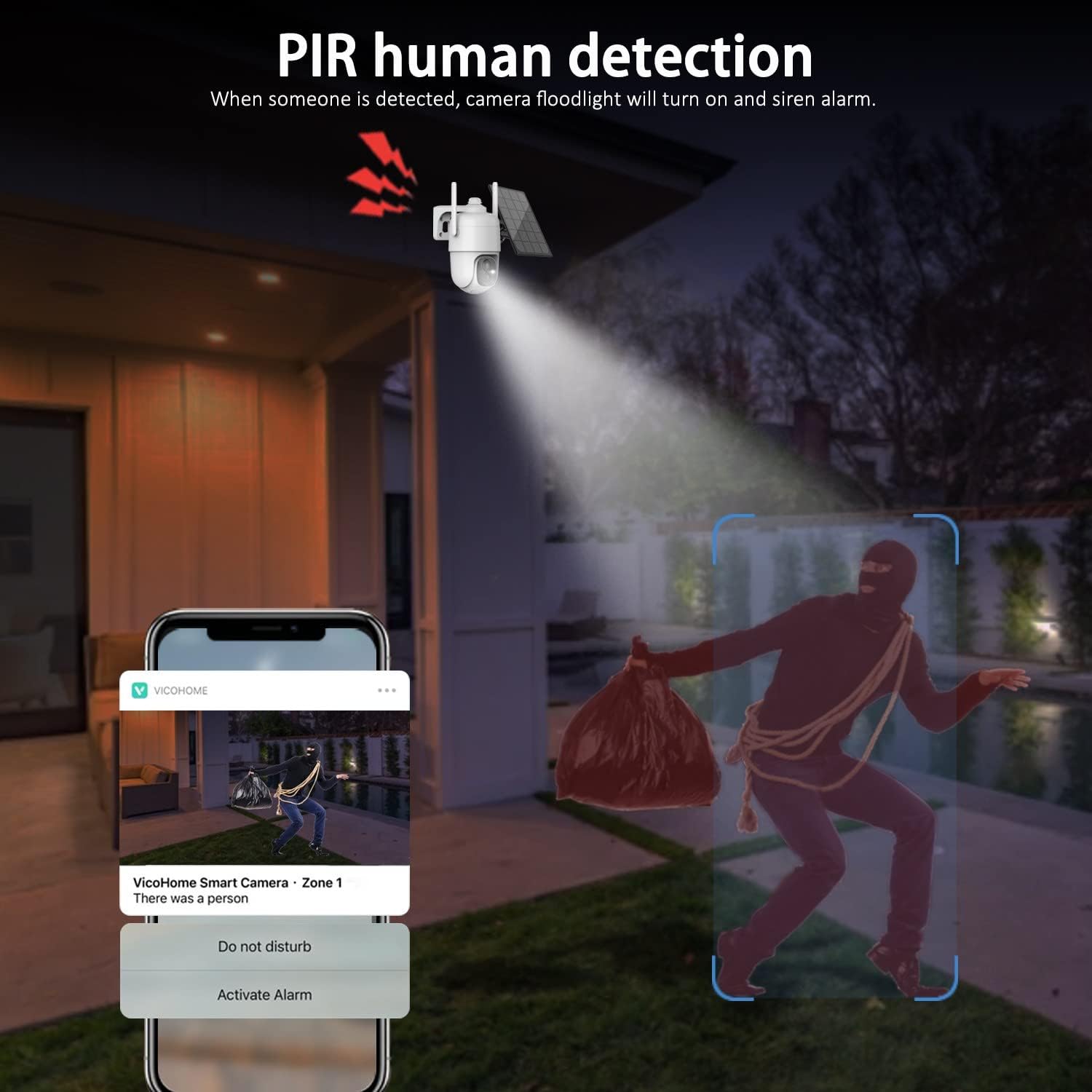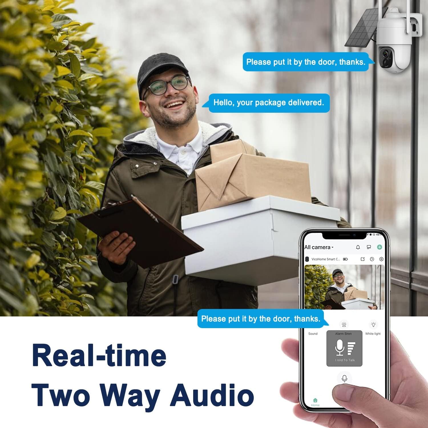 【Instant notification & Siren/Light Alarm】 Built-in highly sensitive speaker, microphone, and PIR detection sensor, once motion is detected, the outdoor wireless camera will instantly push the alarm message to your mobile phone, automatically record alarm videos and audio and make a high-decibel alarm sound/flash-light to warn unwelcome guests, or you can also check the live picture immediately and talk with the visitor.