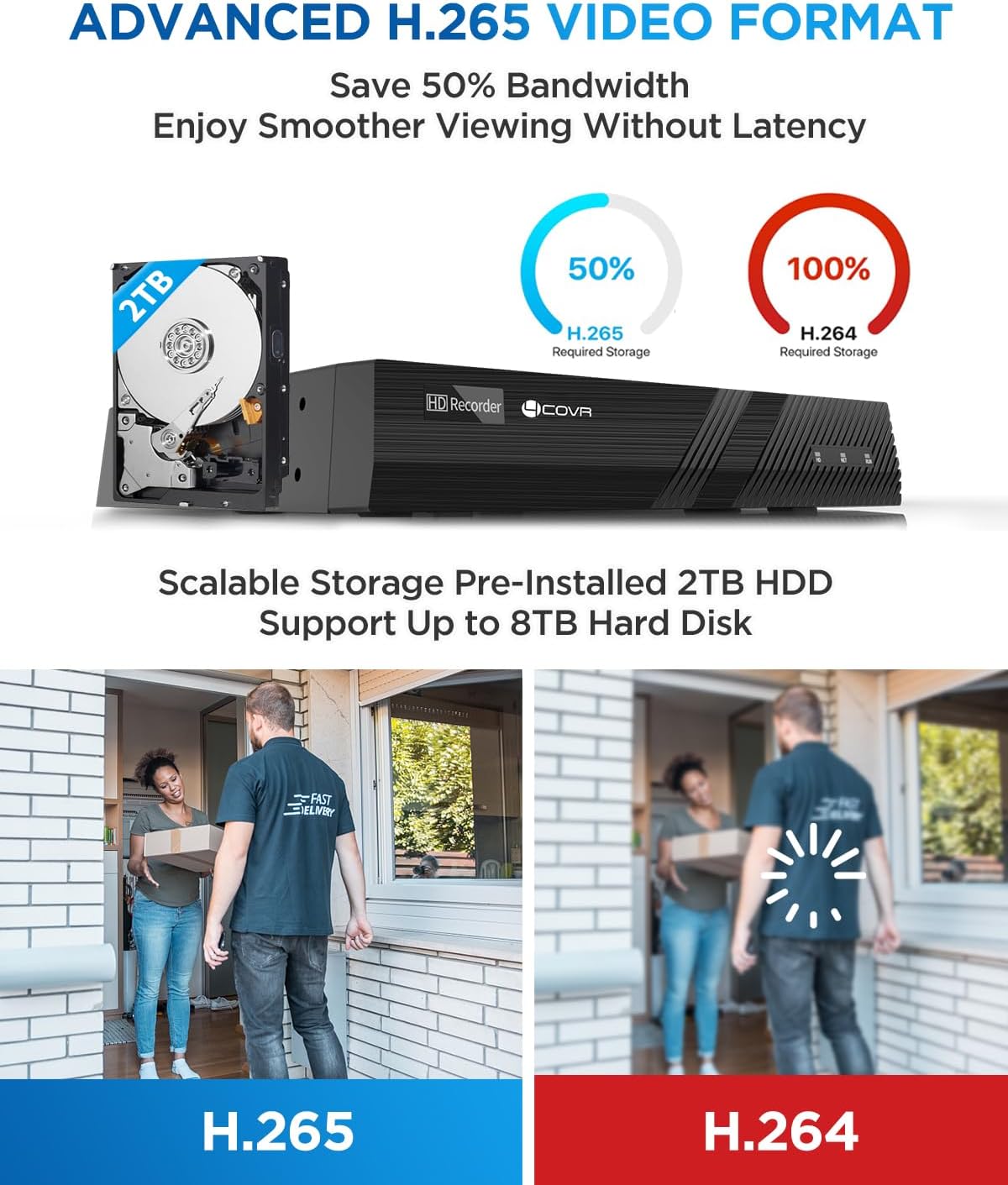 8 CHANNEL VANDAL-PROOF SECURITY CAMERA SYSTEM: It has 4pcs 5MP 2.8mm fixed lens camera produced with IK10 vandal-proof and built-in microphone. The 4K 8CH NVR of this system comes with a 2TB hard drive. it has 1 SATA port to expand to total 8TB storage space.