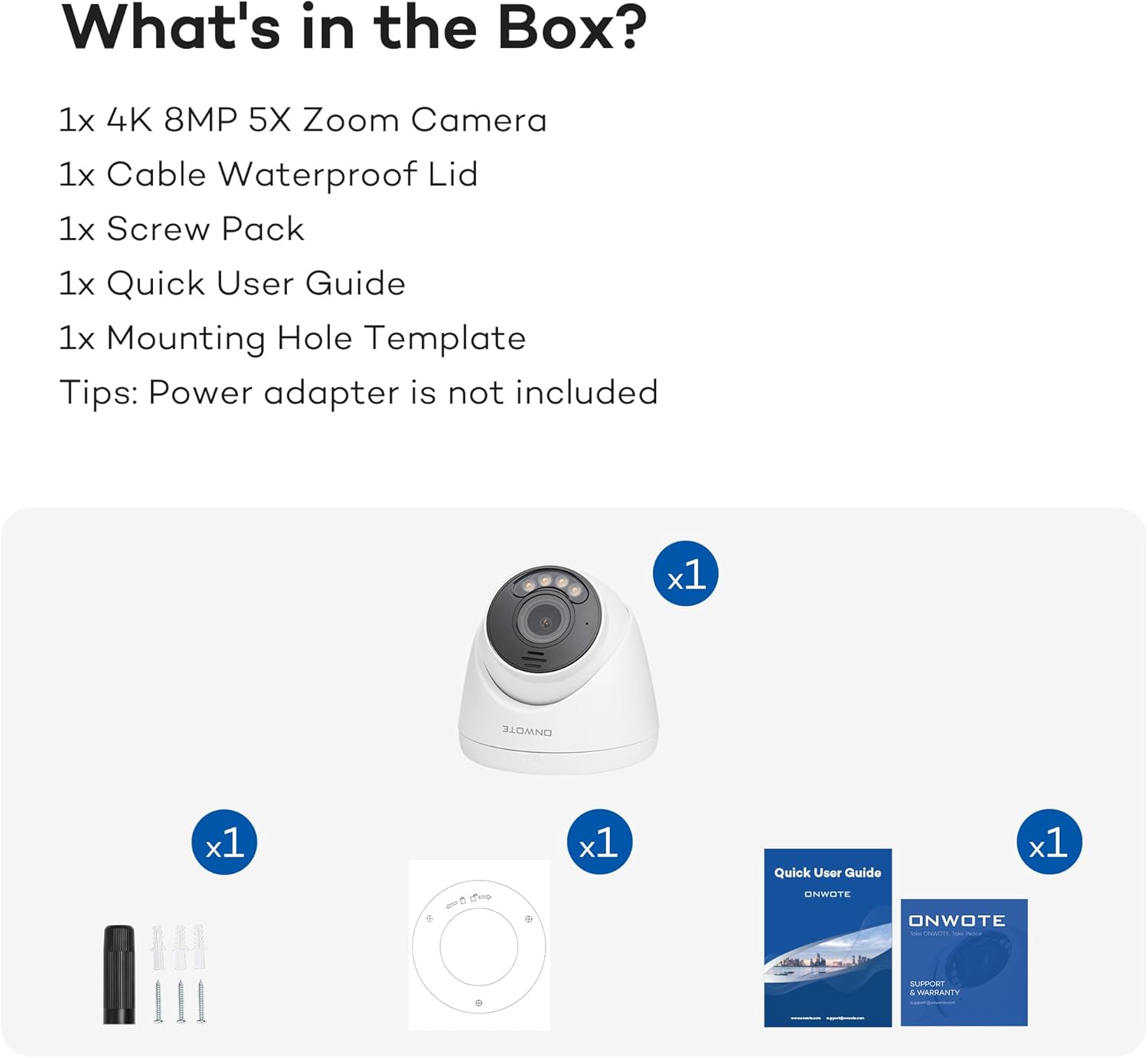 Add-on to ONWOTE System– work with ONWOTE 12MP/ 8MP PoE NVR or PoE switch with 48V-54V power supply.