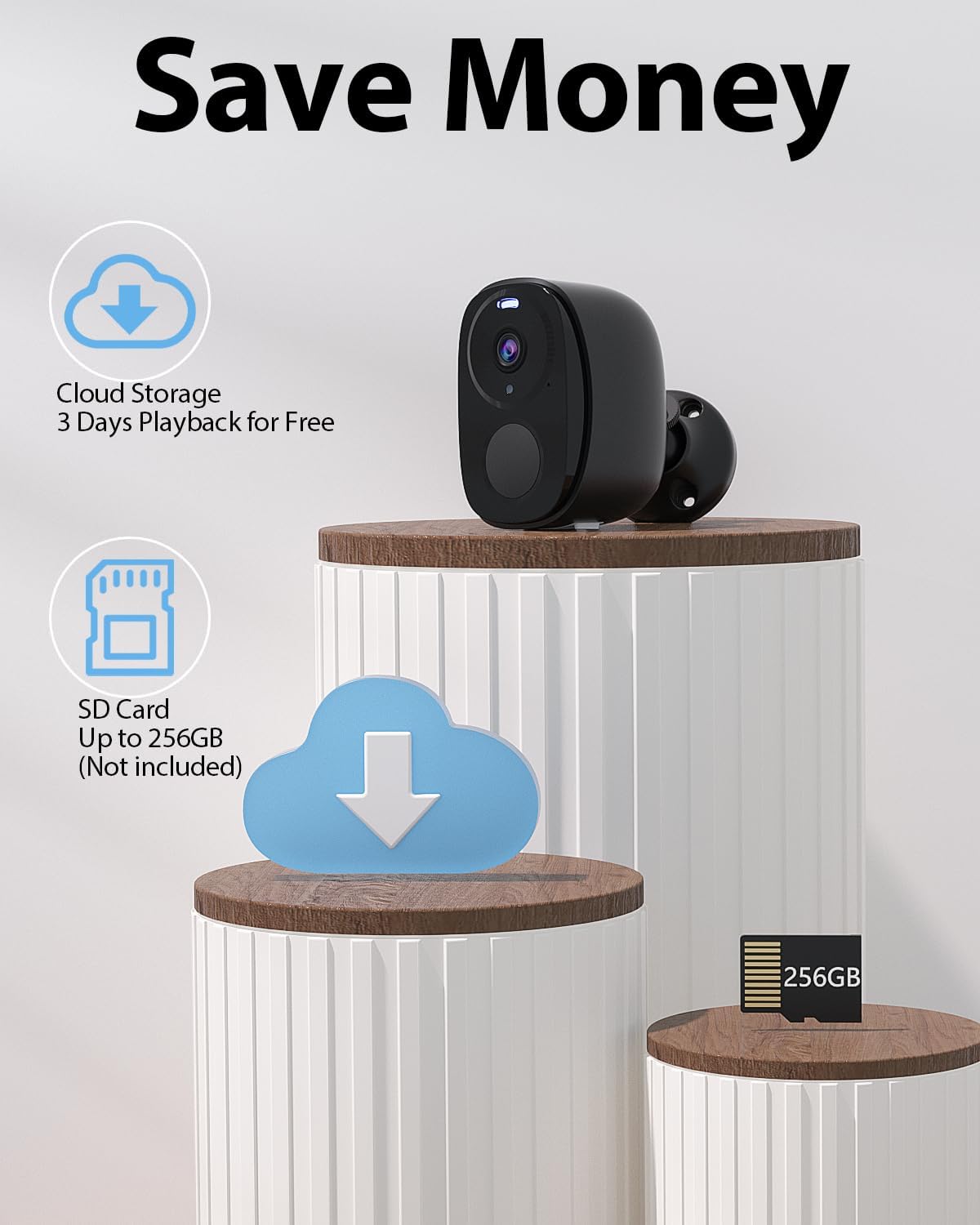 [Advanced Security Features] Benefit from AI motion detection, a siren alarm, and strobe lights that alert you to potential threats and deter intruders. Use real-time two-way audio to issue warnings. Enjoy cloud storage service for the past 3 days or local storage of up to 256 GB (Micro SD card not included).