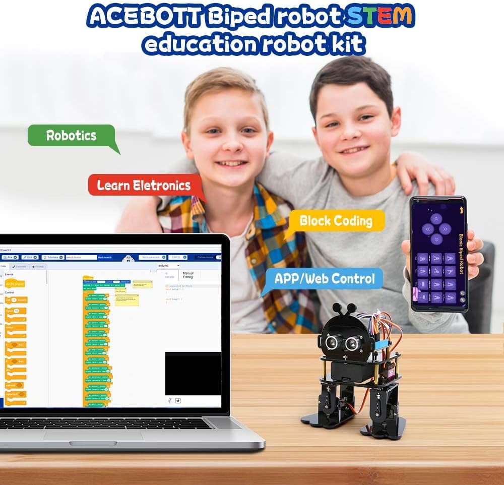 【ACEBOTT STEM Smart Robot Kit】: The ACEBOTT Bipedal Robot Kit is an aluminum alloy kit based on the ESP32 platform, allowing beginners (children) to gain practical experience in programming, electronic assembly and robotics knowledge.