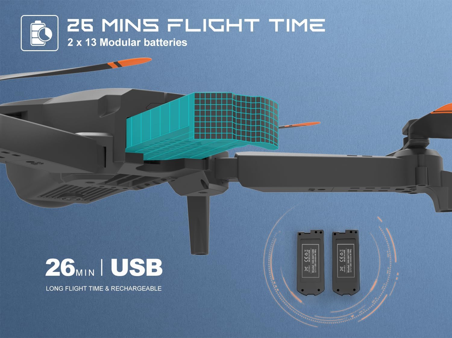 Long Flight Time & Mini Size: The foldable design makes drone compact and portable. Just put it into a bag for outdoor traveling. Includes 2 modular batteries, easy to replace and safe to charge, providing the pocket drone up to 26 minutes of flight time