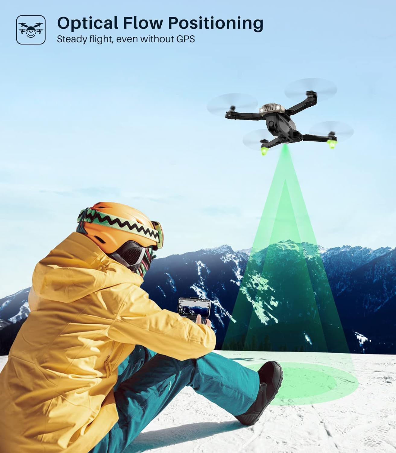 【Double Stability Guarantee】 The GPS system combined with Optical Flow Positioning keeps the foldable drone hover extremely stably in the air both indoors and outdoors.