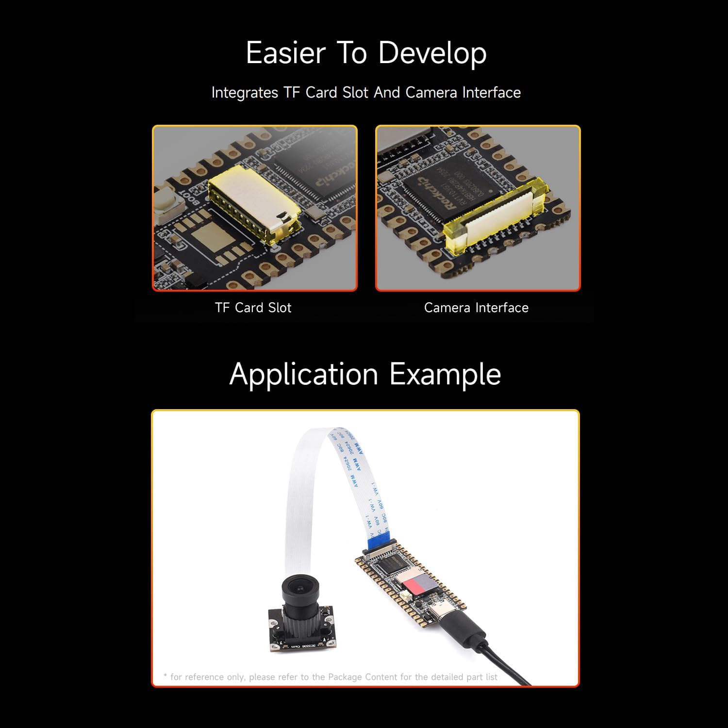 USB Type-C connectorACT-LEDBOOT button Press it when powering on to enter download modeTF card slotRV1103 Vision processor SoC with built-in ARM Cortex-A7 coreCSI camera interface MIPI CSI 2-laneGPIO headerUSB test padsBOOT test padMicrophone test padsEthernet interface pads
