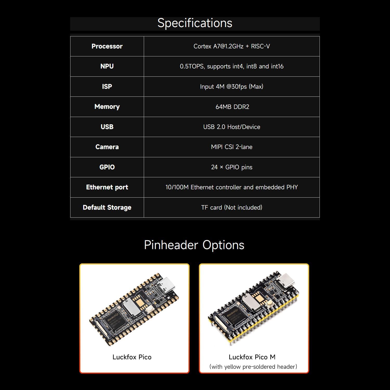 With yellow pre-soldered header. Luckfox Pico is a cost-effective Linux micro development board, based on the Rockchip RV1103 chip to provide a simple and efficient development platform for developers; Supports a variety of interfaces including MIPI CSI, GPIO, UART, SPI, 12C, USB, etc., which is convenient for developing and debugging quickly.