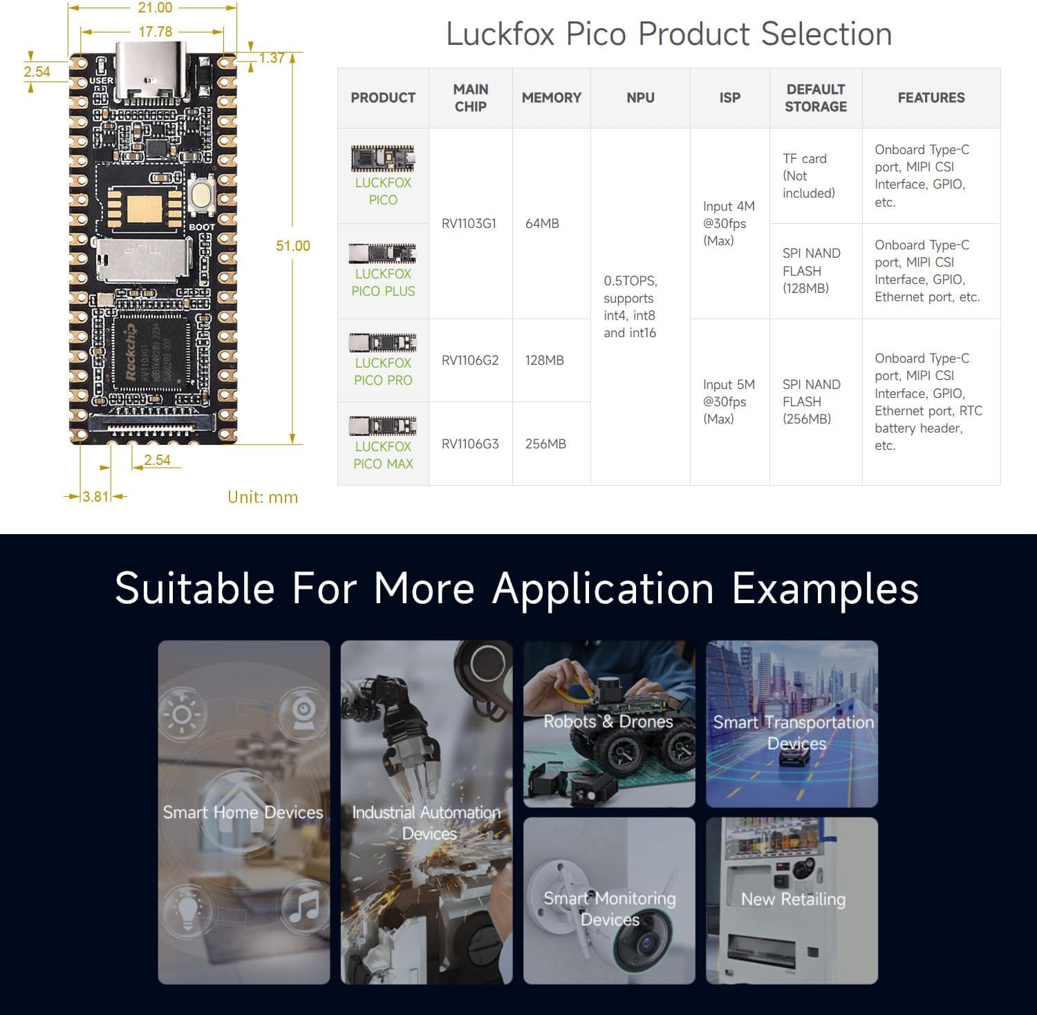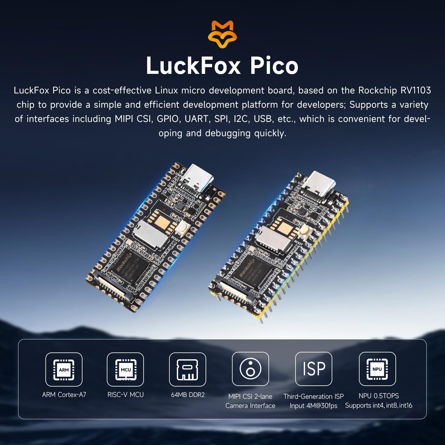 LuckFox Pico is a cost-effective Linux micro decelopment board, based on the Rockchip RV1103 chip to provide a simple and efficient development platform for developers; Supports a variety of interfaces including MIPI CSI, GPIO, UART, SPI, 12I, USB, etc., which is convenient for developing and debugging quickly
