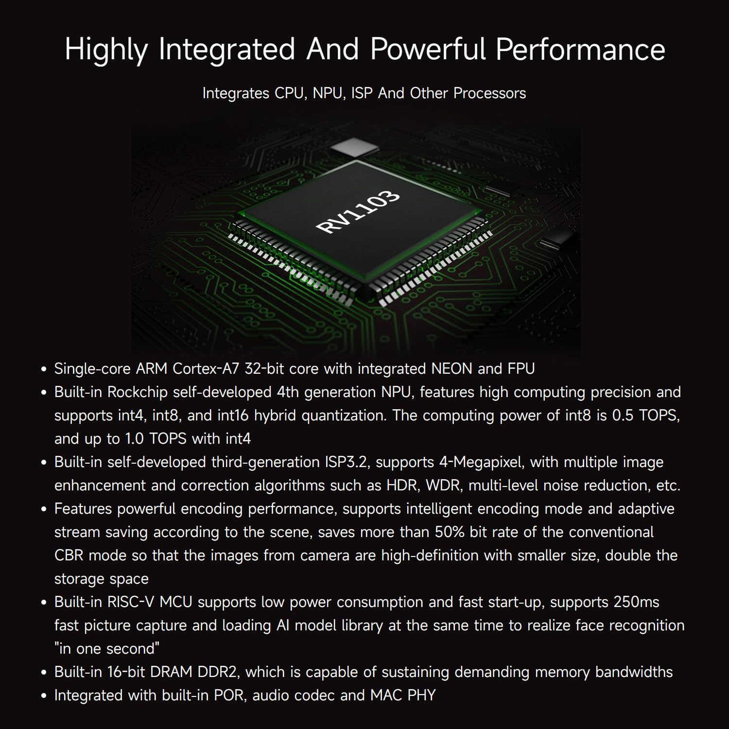 Single-core ARM Cortex-A7 32-bit core with integrated NEON and FPUBuilt-in Rockchip self-developed 4th generation NPU, features high computing precision and supports int4, int8, and int16 hybrid quantization. The computing power of int8 is 0.5 TOPS, and up to 1.0 TOPS with int4Built-in self-developed third-generation ISP3.2, supports 4-Megapixel, with multiple image enhancement and correction algorithms such as HDR, WDR, multi-level noise reduction, etc.Features powerful encoding performance, supports intelligent encoding mode and adaptive stream saving according to the scene, saves more than 50% bit rate of the conventional CBR mode so that the images from camera are high-definition with smaller size, double the storage spaceBuilt-in RISC-V MCU supports low power consumption and fast start-up, supports 250ms fast picture capture and loading AI model library at the same time to realize face recognition “in one second”Built-in 16-bit DRAM DDR2, which is capable of sustaining demanding memory bandwidthsIntegrated with built-in POR, audio codec and MAC PHY