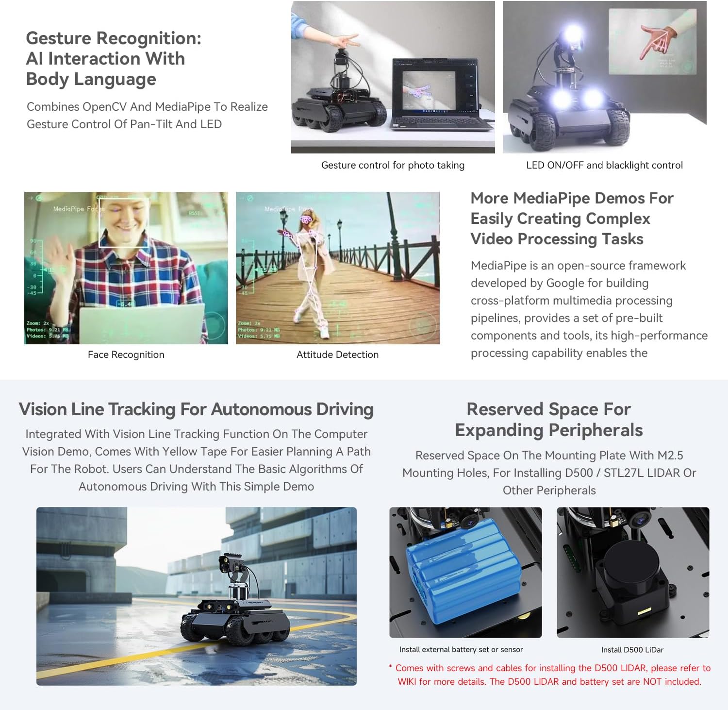 [Kit Selection] Optional Pan-Tilt Module (PT Version only) for better expansion potential. Options for host controller (Raspberry Pi 4B / Raspberry Pi 5), or you can choose the Acce Version if you’ve got a Pi. All kits are equipped with a camera, mounting accessories, TF card, cooling fan, etc.