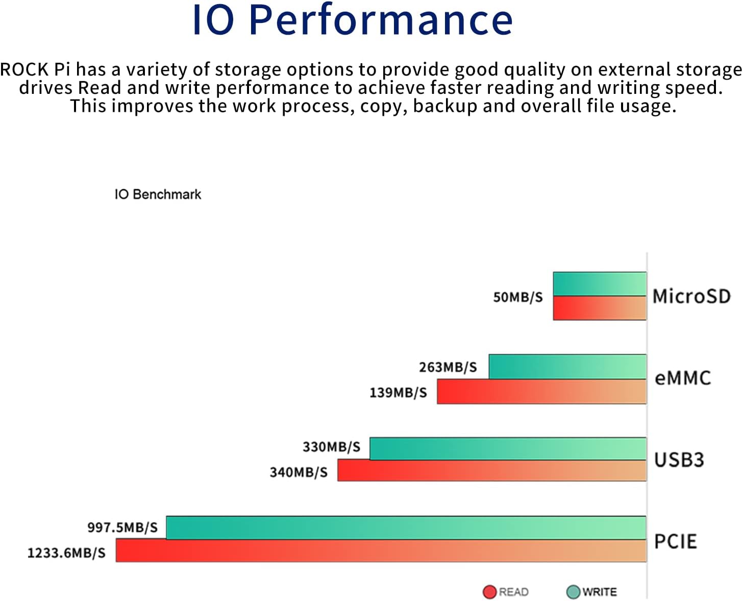 IO performance-ROCK Pi development board comes with multiple storage options and providing read and write performance on external storage drives. This improves workflow, copying, backups and overall file usage