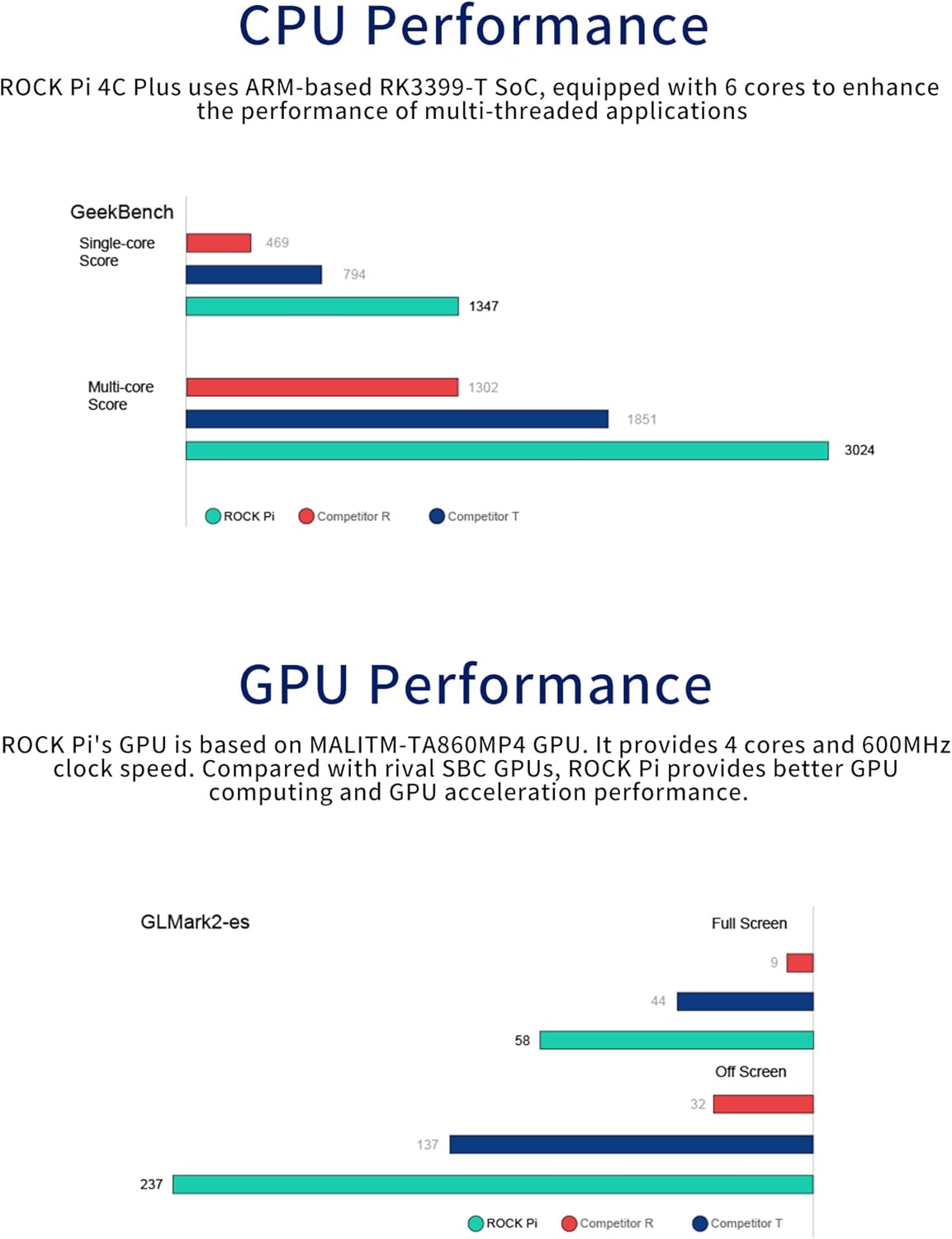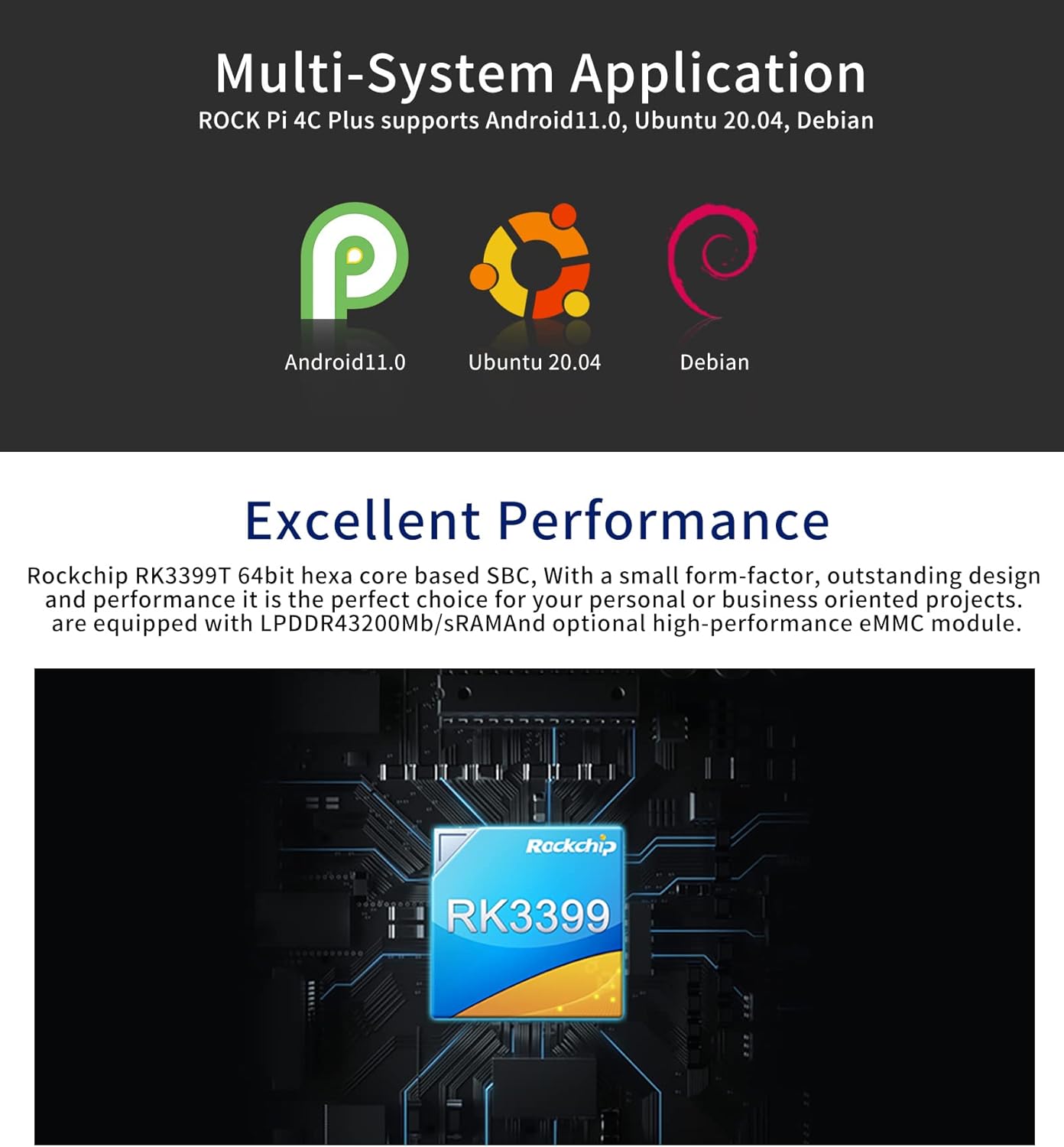 Class-Leading Performance-ROCK Pi has a modern and powerful hexa-core ARM based RK3399-T Soc, All models are equipped with LPDDR4 3200Mb/s RAM and optional high performance eMMC modules