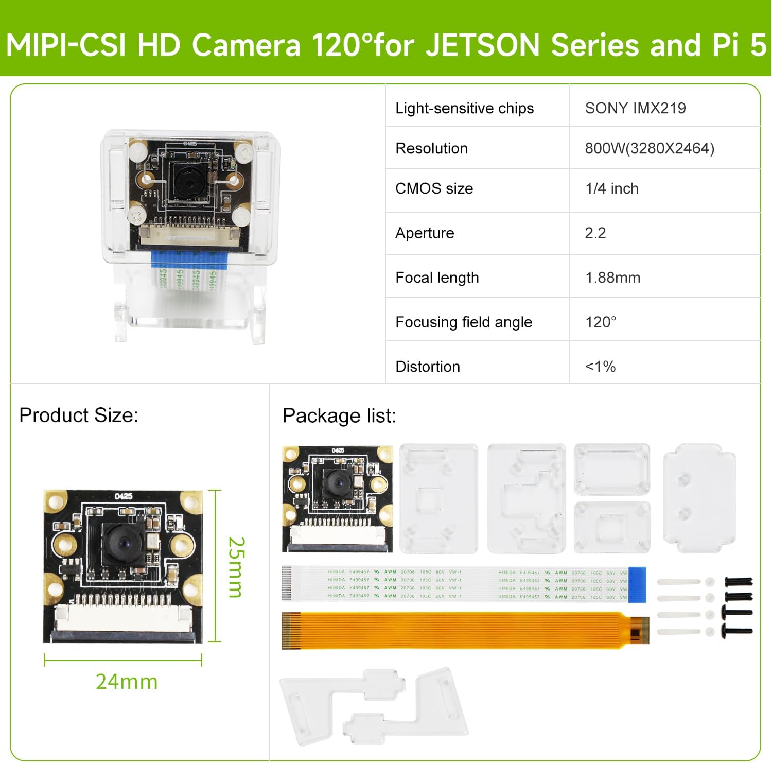 3 wide-angle cameras are optional: 77°/120°/160° wide-angle camera, 8MP (8 megapixels) IMX219 chip, resolution up to 3280×2464. The camera supports all series of Jetson Orin/Nano. The 15pin cable is compatible with Nano B01, Xavier NX and TX2-NX; the 22pin cable is compatible with Jetson Orin Nano series and raspberry Pi 5.